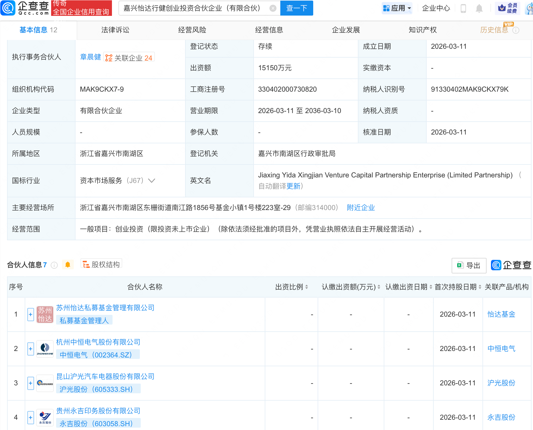 企查查APP显示,近日,嘉兴怡达行健创业投资合伙企业(有限合伙)成立,经营范围包含:创业投资(限投资未上市企业)。企查查股权穿透显示,该企业由中恒电气(维权)(002364.SZ)、沪光股份(605333.SH)、永吉股份(603058.SH)等共同出资。