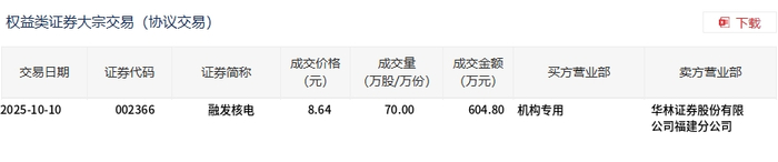 10月10日,融发核电大宗交易成交70万股,成交额604.8万元,占当日总成交额的0.15%,成交价8.64元,较市场收盘价8.73元折价1.03%。