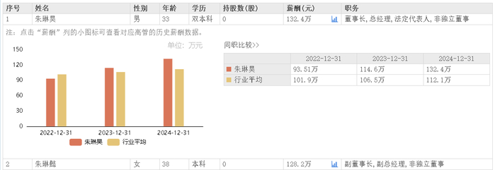 据东方财富网数据,康力电梯董事长兼总经理朱琳昊2024年所获薪酬132.4万元,副董事长、副总经理朱琳懿同年领薪128.2万元。