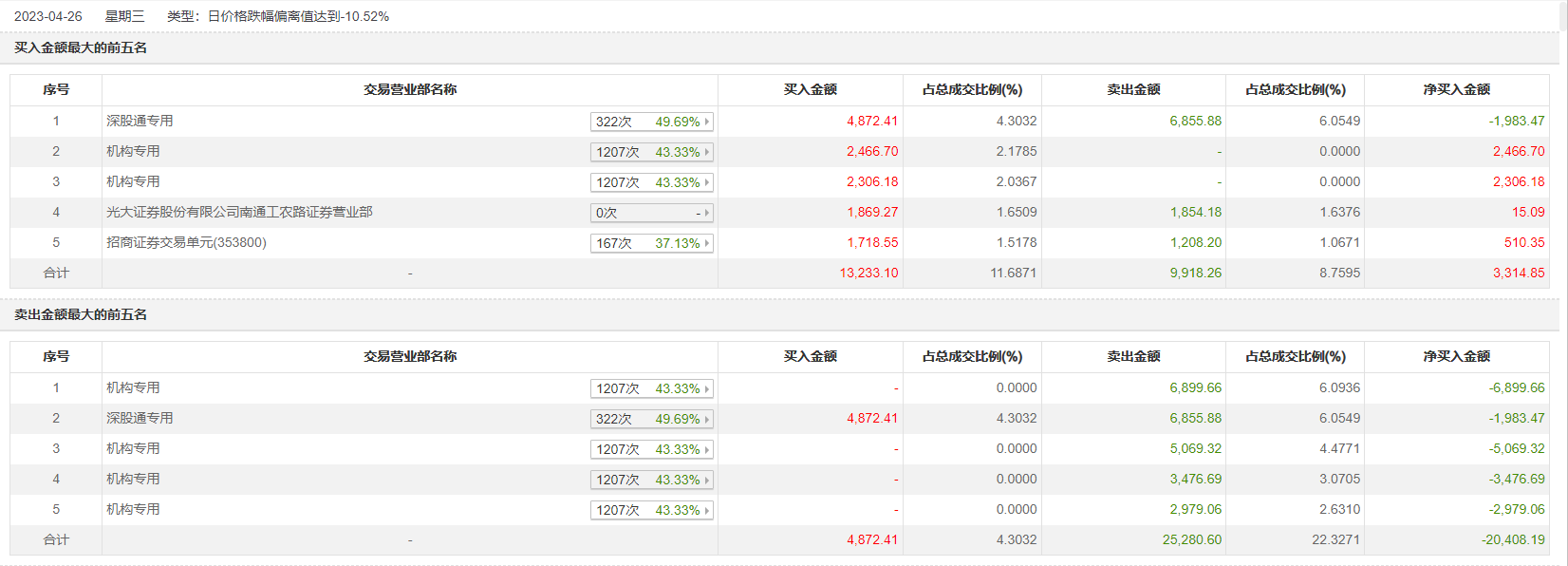 4月26日,太极股份今日跌停,成交额11.32亿元,换手率4.62%,盘后龙虎榜数据显示,深股通买入4872.41万元并卖出6855.88万元,2家机构净买入4772.88万元,4家机构净卖出1.84亿元。