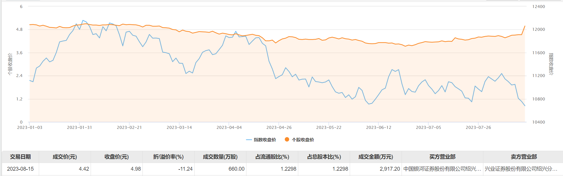 8月15日大宗交易成交660万股,成交额2917.2万元,占当日总成交额的15.19%,成交价4.42元,较市场收盘价4.98元折价11.24%。