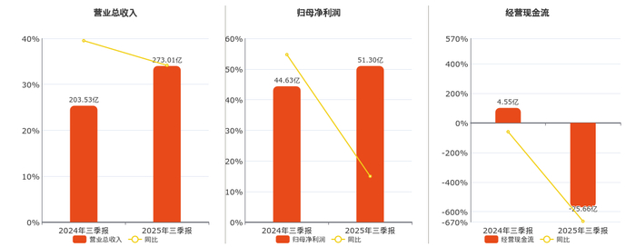 公司营业总收入为273.01亿元,在已披露的同业公司中排名第3,较去年同报告期营业总收入增加67.69亿元,实现5年连续上涨,同比较去年同期上涨32.97%。归母净利润为51.30亿元,在已披露的同业公司中排名第1,较去年同报告期归母净利润增加6.63亿元,实现5年连续上涨,同比较去年同期上涨14.83%。经营活动现金净流入为-25.66亿元。