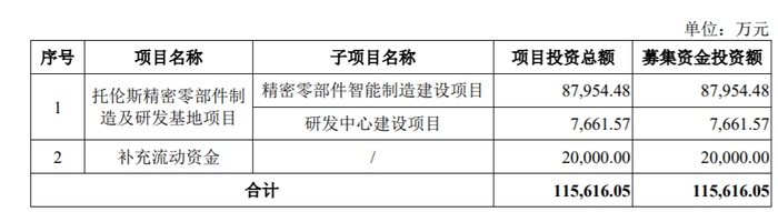 本次IPO,托伦斯本次募集资金投资额11.56亿元,分别用于托伦斯精密零部件制造及研发基地项目和补充流动资金。