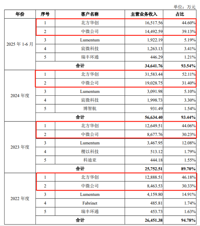 报告期内,公司对第一大客户北方华创的销售收入分别为1.29亿元、1.26亿元、3.16亿元和1.65亿元,占各期主营业务收入的比例分别为46.18%、44.06%、52.11%和44.60%。