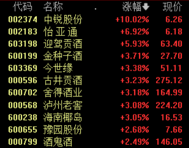12月27日,白酒板块盘中拉升。截至午盘,中锐股份涨停,怡亚通涨超6%,迎驾贡酒涨超5%,古井贡酒、泸州老窖、酒鬼酒等多股跟涨。
