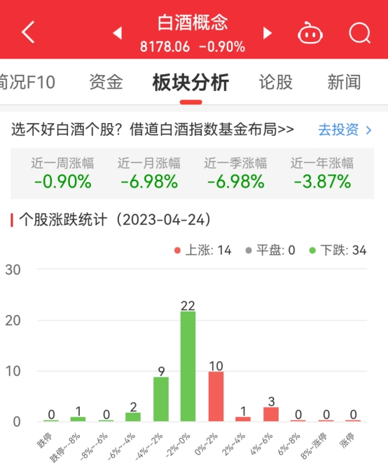 中国经济网北京4月24日讯今日,白酒概念板块整体跌幅0.90%,其中14只股票上涨,0只股票平盘,34只股票下跌。