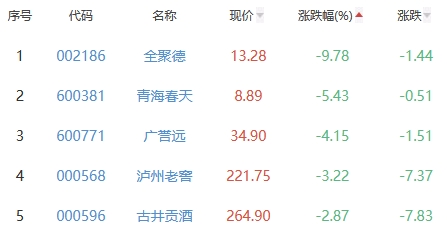 全聚德、青海春天、广誉远、泸州老窖、古井贡酒位列涨幅榜后五位,涨幅分别为-9.78%、-5.43%、-4.15%、-3.22%、-2.87%。