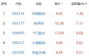 其中,中锐股份、来伊份、*ST皇台、大湖股份、苏盐井神位列板块涨幅前五位,涨幅分别为1.38%、1.11%、0.68%、0.62%、0.51%。