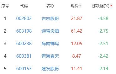 吉宏股份、迎驾贡酒、海南椰岛、青海春天、建发股份位列涨幅榜后五位,涨幅分别为-4.58%、-2.75%、-2.51%、-2.42%、-2.14%。