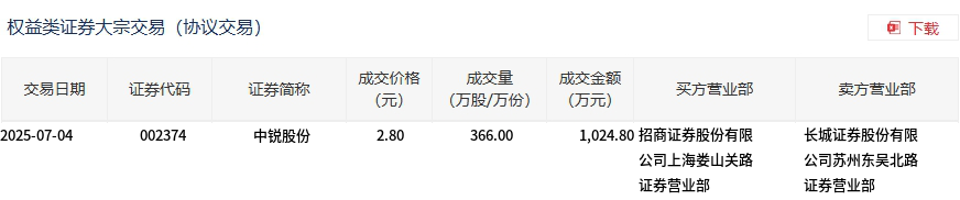 中锐股份今日大宗交易折价成交366万股,成交额1024.8万元