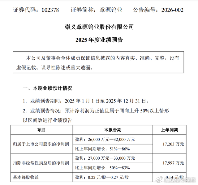 根据此前披露的业绩预告显示,2025年章源钨业净利润为2.6亿元至3.2亿元,同比增长51%至86%,上年同期为1.72亿元;扣非净利润为2.7亿元至3.3亿元,同比增长50%至83%。