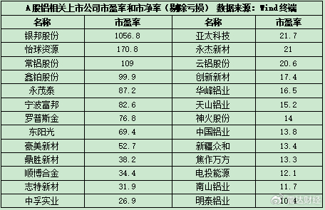 A股铝相关上市公司市盈率和市净率(剔除亏损) 数据来源:Wind终端