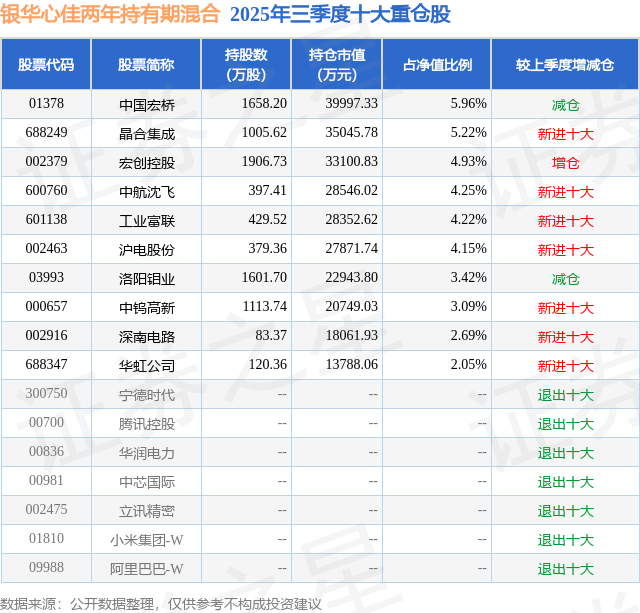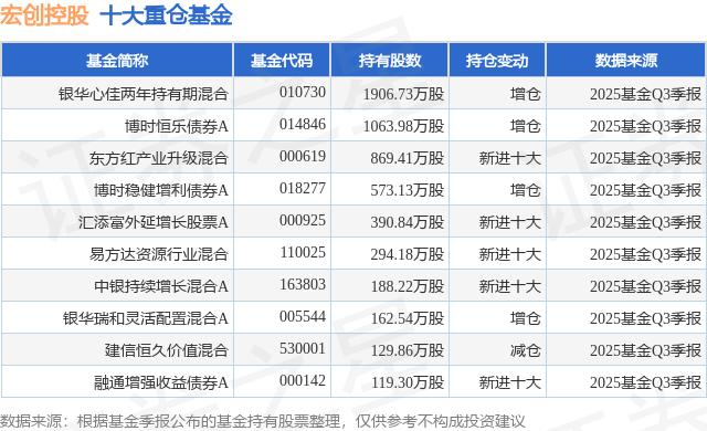 根据2025基金Q3季报公募基金重仓股数据,重仓该股的公募基金共55家,其中持有数量最多的公募基金为银华基金的银华心佳两年持有期混合。银华心佳两年持有期混合目前规模为67.16亿元,最新净值0.9431(12月31日),较上一交易日下跌1.1%,近一年上涨51.77%。该公募基金现任基金经理为李晓星 张腾 杜宇。张腾在任的基金产品包括:银华瑞和灵活配置混合A,管理时间为2024年3月7日至今,期间收益率为57.12%;银华甄选价值成长混合A,管理时间为2024年8月7日至今,期间收益率为44.78%;银华甄选价值回报混合A,管理时间为2025年9月18日至今,期间收益率为0.83%。李晓星在任的基金产品包括:银华中小盘混合,管理时间为2015年7月7日至今,期间收益率为252.58%;银华盛世精选灵活配置混合发起式A,管理时间为2016年12月22日至今,期间收益率为122.03%;银华心诚灵活配置混合A,管理时间为2018年3月12日至今,期间收益率为81.68%;银华心怡灵活配置混合A,管理时间为2018年7月5日至今,期间收益率为230.44%。杜宇在任的基金产品包括:银华中小盘混合,管理时间为2019年12月11日至今,期间收益率为86.38%;银华丰享一年持有期混合,管理时间为2022年1月26日至今,期间收益率为6.43%;银华心质混合A,管理时间为2023年3月30日至今,期间收益率为27.8%;