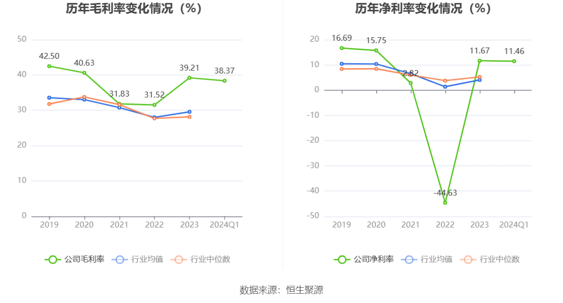 2024年第一季度,公司毛利率为38.37%,同比上升0.52个百分点;净利率为11.46%,较上年同期上升7.98个百分点。