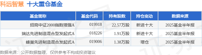持有科远智慧最多的基金为招商中证2000指数增强A,目前规模为3.21亿元,最新净值1.6686(10月21日),较上一交易日上涨1.76%,近一年上涨56.42%。该基金现任基金经理为王平 刘浒。