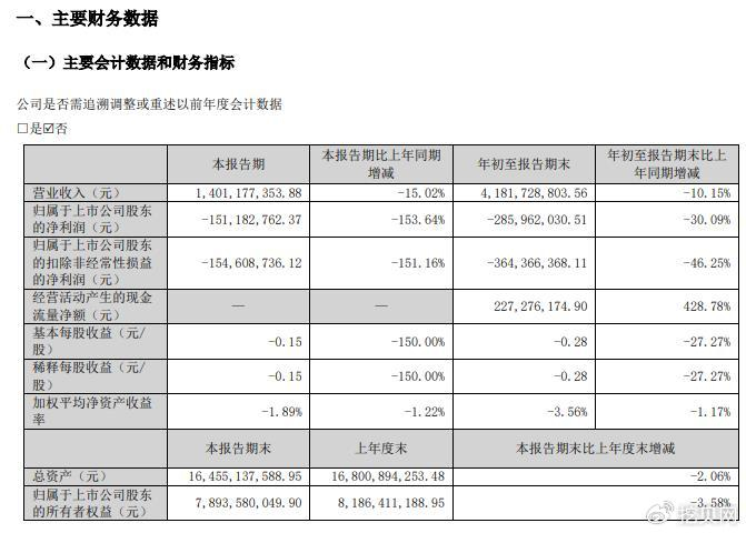 挖贝网10月30日,蓝帆医疗(002382)发布三季度业绩报告,本季度实现营收14亿元,同比下降15.02%。亏损1.5亿元,这是继上个季度亏损2.12亿元后第二季度亏损。