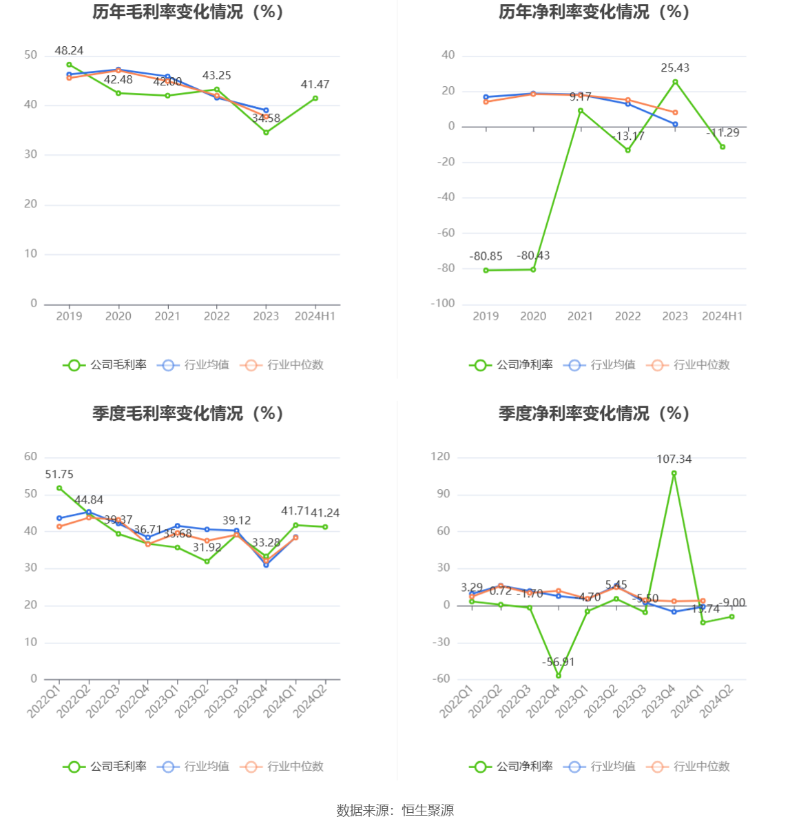 2024年上半年,公司毛利率为41.47%,同比上升8.06个百分点;净利率为-11.29%,较上年同期下降12.72个百分点。从单季度指标来看,2024年第二季度公司毛利率为41.24%,同比上升9.32个百分点,环比下降0.47个百分点;净利率为-9.00%,较上年同期下降14.45个百分点,较上一季度上升4.74个百分点。