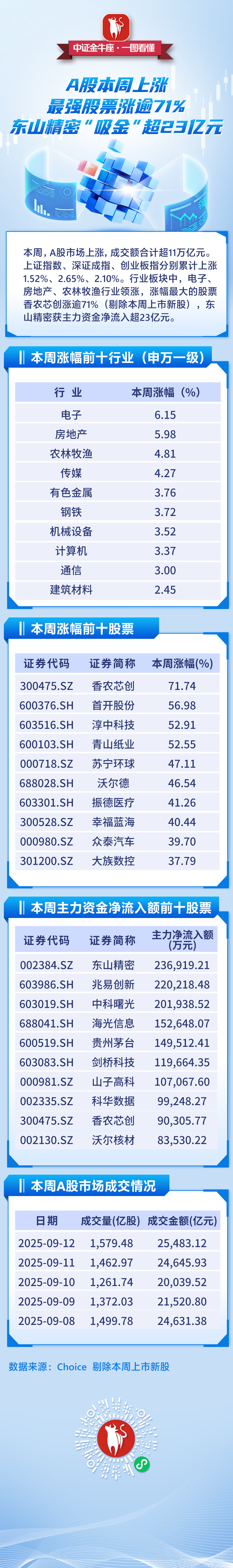 【一图看懂】A股本周上涨,最强股票涨逾71%,东山精密“吸金”超23亿元