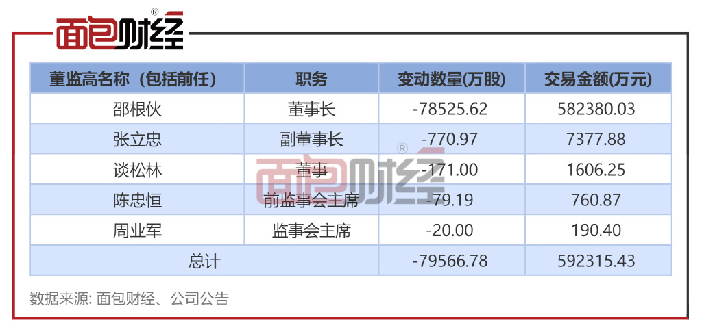 信披数据显示,2019年5月至2022年2月期间,公司5位董监高累计减持约7.96亿股,交易金额共计约59.23亿元,其中实控人及董事长邵根伙持续减持公司股票最多,达7.85亿股,交易金额高达58.24亿元。