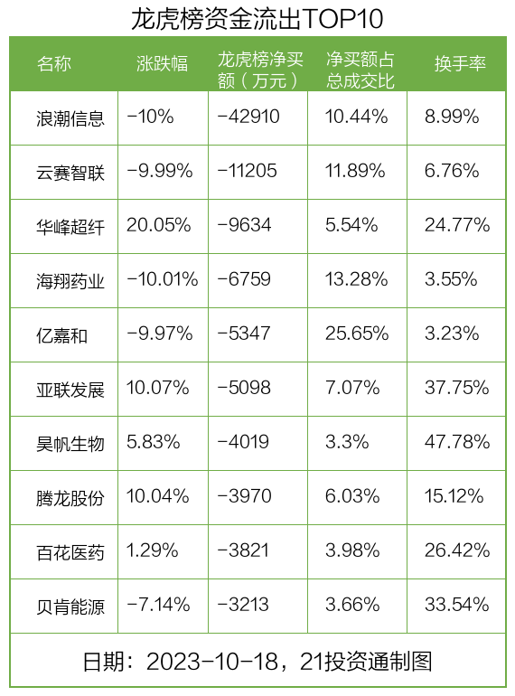 而龙虎榜中资金净流出最多的是浪潮信息(000977.SZ),被净卖出为4.29亿元,占总成交金额的10.44%。浪潮信息收盘下跌10%,换手率为8.99%。