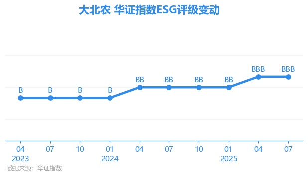 日前,华证指数公布了新一期(2025年7月31日)的ESG评级结果,大北农(002385.SZ)获得BBB评级(华证指数评级为C起至AAA九档,C为最低档,AAA为其最高一级评级/AA为其第二档),上一期(2025年4月30日)ESG评级为BBB。本期ESG评级在156家食品行业A股上市公司中排名第25(上一期排名第24)。