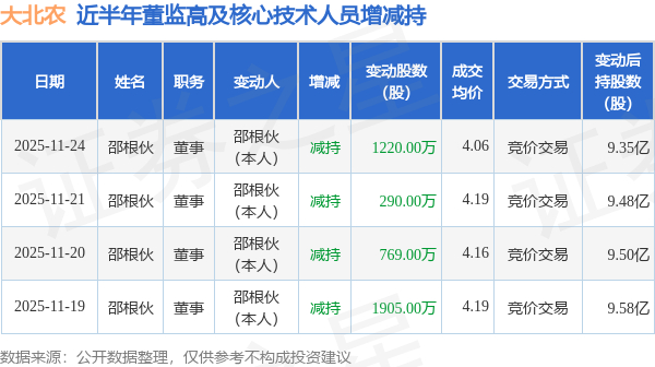 证券之星消息,根据11月25日市场公开信息、上市公司公告及交易所披露数据整理,大北农(002385)最新董监高及相关人员股份变动情况:2025年11月24日公司董事邵根伙共减持公司股份1220.0万股,占公司总股本为0.2837%。变动期间公司股价下跌0.49%,11月24日当日收盘报4.06元。