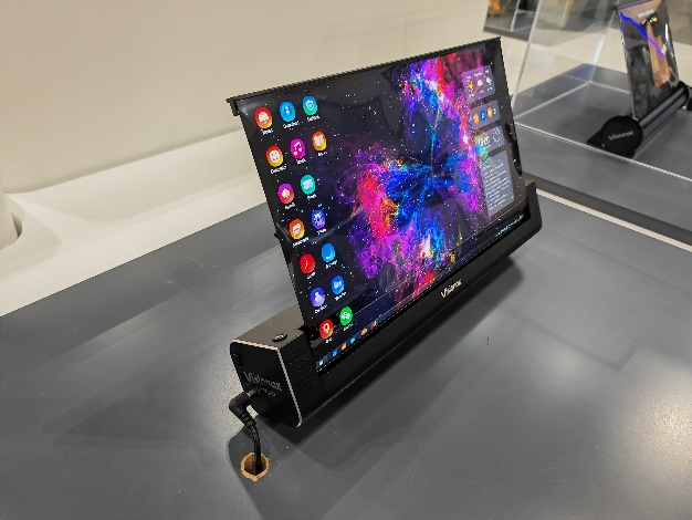同时,针对中尺寸的笔电市场,维信诺在本次展会发布了便携式、可卷曲笔记本电脑创新终端,搭载14英寸AMOLED显示屏,实现卷曲收纳,让笔电“能伸能曲”,摆脱了传统笔电的刻板形态,而且收纳状态的整机直径仅64mm,使终端更轻便、更小巧。