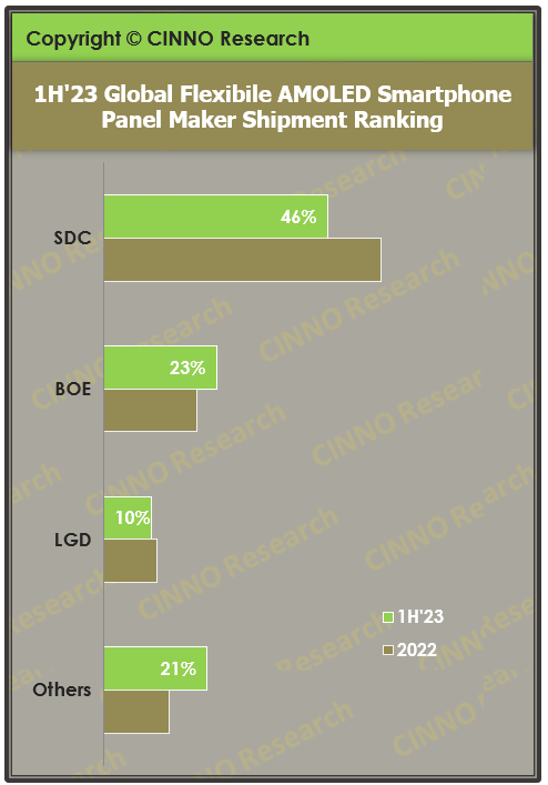 据群智咨询研报,2023年上半年全球智能手机OLED面板出货量2.2亿片,同比增长约32.8%。从市场份额的竞争格局看,三星显示(SDC)占49.9%,同比减少18.2个百分点;京东方(BOE)占16.2%,同比增加4个百分点;维信诺占9.5%,同比增加2.5个百分点。