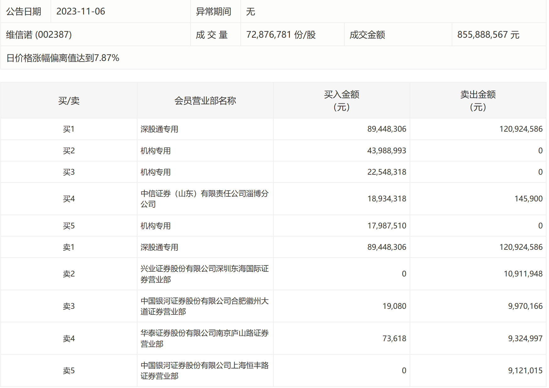 11月6日,维信诺今日涨停,全天换手率达5.31%,振幅达10.57%。龙虎榜数据显示,营业部席位合计净买入3260.15万元。其中,机构合计净买入8452.48万元。此外,深股通专用、中信证券(山东)淄博分公司分别买入8944.83万元、1893.43万元;深股通专用、兴业证券深圳东海国际证券营业部分别卖出1.21亿元、1091.19万元。