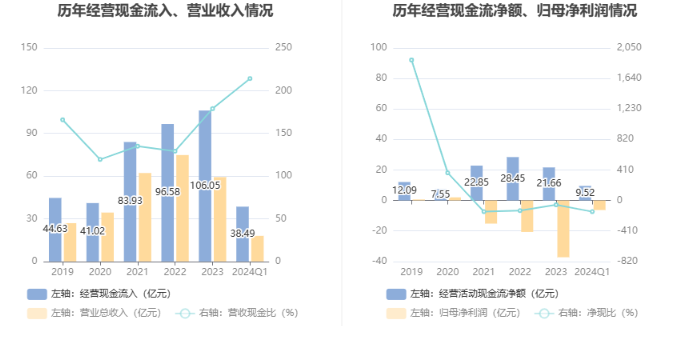 2024年第一季度,公司营业收入现金比为214.24%,净现比为-151.08%。