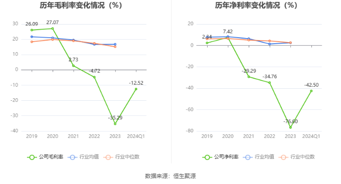 2024年第一季度,公司毛利率为-12.52%,同比上升11.99个百分点;净利率为-42.50%,较上年同期上升78.19个百分点。