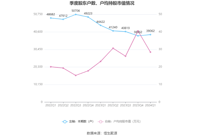 筹码集中度方面,截至2024年一季度末,公司股东总户数为3.91万户,较上年末增长了700户,增幅1.82%;户均持股市值由上年末的40.60万元下降至28.49万元,降幅为29.83%。