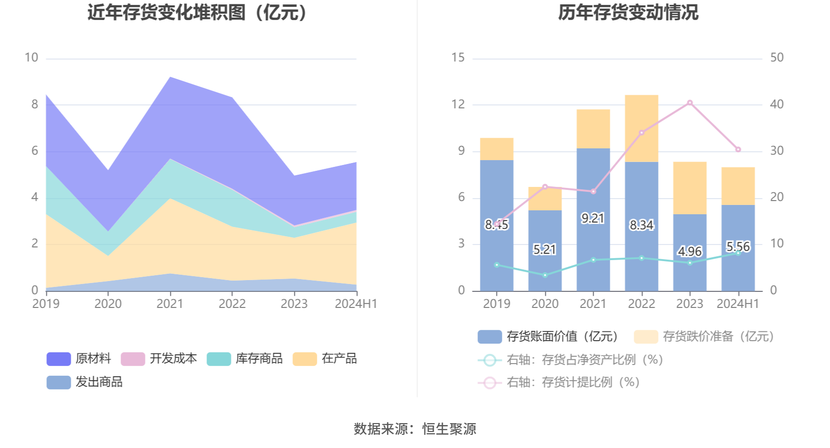 从存货变动来看,截至2024年上半年末,公司存货账面价值为5.56亿元,占净资产的8.18%,较上年末增加6026.95万元。其中,存货跌价准备为2.43亿元,计提比例为30.45%。