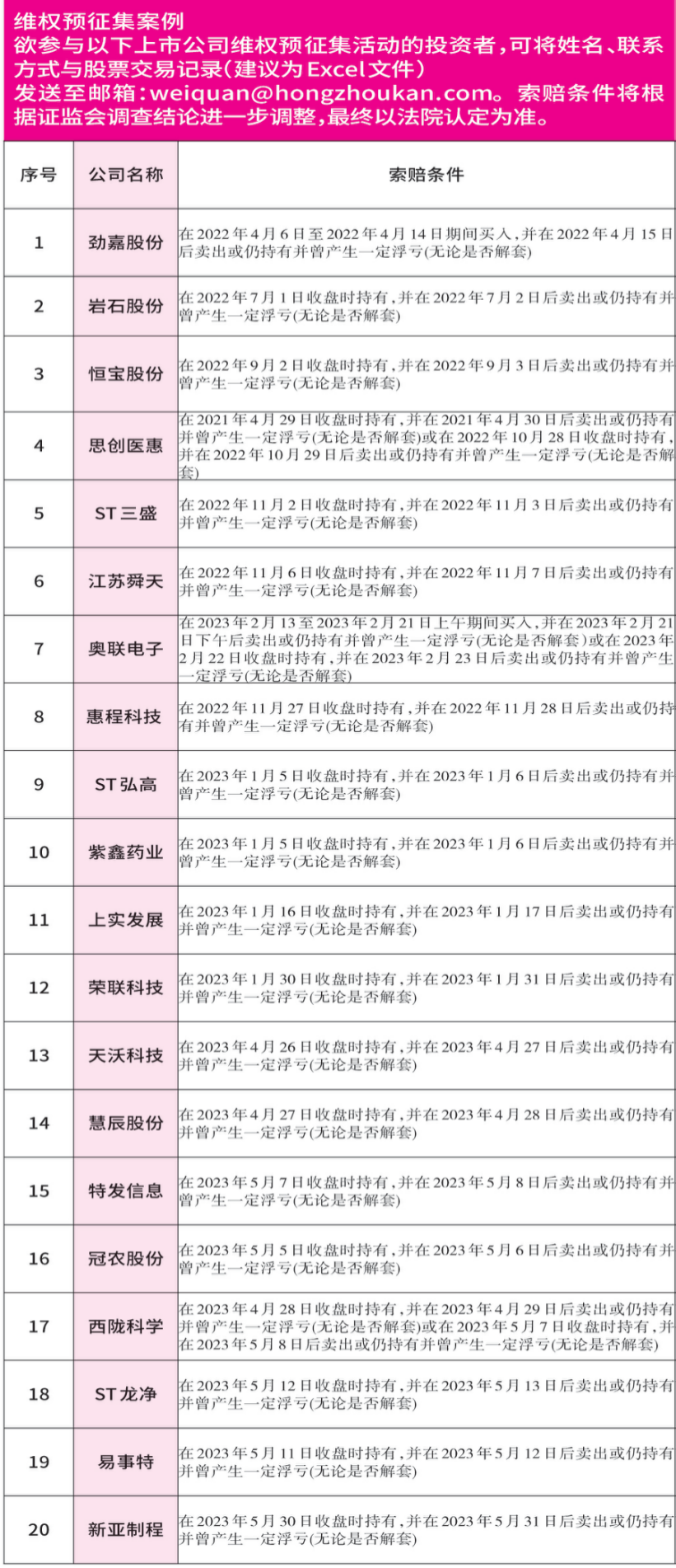 基于以上违法事实,根据相关司法解释,如果投资者在2023年5月30日收盘时持有新亚制程,并在2023年5月31日后卖出或仍持有并曾产生一定浮亏(无论是否解套)均可发起索赔,您可登录证券市场红周刊官网,通过“民间维权”频道进行在线维权,参与由《证券市场红周刊》“民间维权”栏目组织的索赔征集活动,以维护自身合法权益。广大投资者在获得赔偿前无需支付任何律师费用。