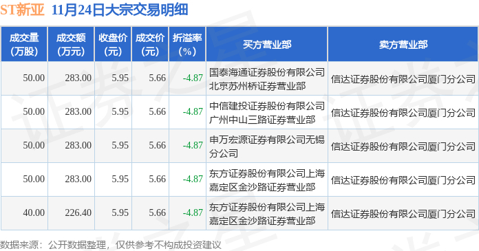 证券之星消息,11月24日ST新亚发生大宗交易,交易数据如下: