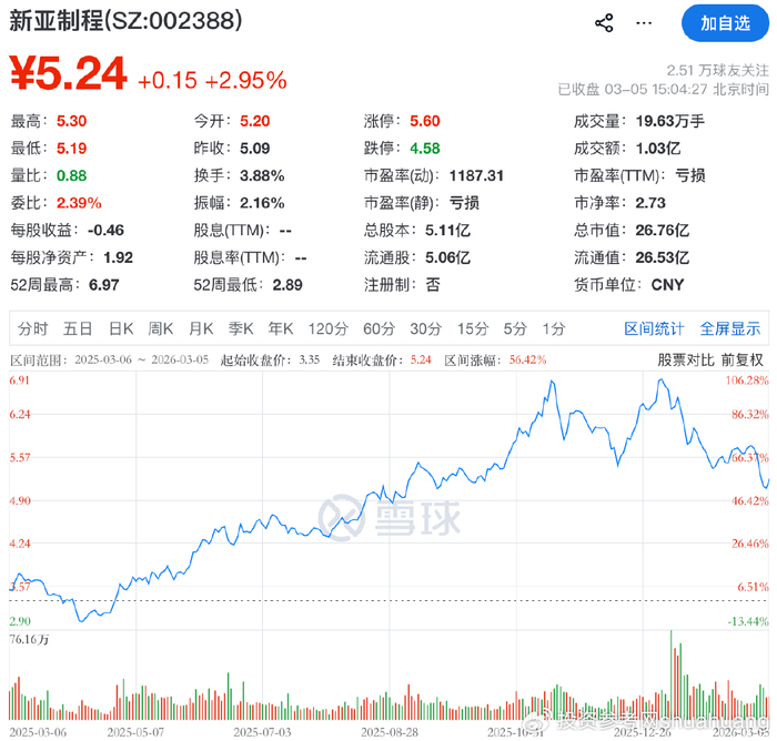 二级市场表现方面,截至 3 月 5 日收盘,新亚制程股价报 5.24 元 / 股,当日上涨 2.95%,公司对应总市值为 26.76 亿元。