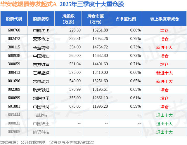 根据2025基金Q3季报公募基金重仓股数据,重仓该股的公募基金共16家,其中持有数量最多的公募基金为华安基金的华安乾煜债券发起式A。华安乾煜债券发起式A目前规模为149.22亿元,最新净值1.2025(1月12日),较上一交易日上涨0.38%,近一年上涨9.38%。该公募基金现任基金经理为郑伟山 邹维娜 倪逸芸。邹维娜在任的基金产品包括:华安沣信债券A,管理时间为2023年7月18日至今,期间收益率为13.85%。郑伟山在任的基金产品包括:华安新乐享灵活配置混合A,管理时间为2022年5月25日至今,期间收益率为12.69%;华安强化收益债券A,管理时间为2022年9月16日至今,期间收益率为36.86%;华安添颐混合A,管理时间为2023年3月23日至今,期间收益率为11.81%。倪逸芸在任的基金产品包括:华安安浦债券A,管理时间为2025年6月4日至今,期间收益率为0.56%;华安沣信债券A,管理时间为2025年6月4日至今,期间收益率为5.04%;华安添顺债券,管理时间为2025年6月4日至今,期间收益率为0.63%。