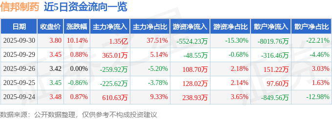 证券之星消息,信邦制药9月30日涨停收盘,收盘价3.8元。该股于10点48分涨停,未打开涨停,截止收盘封单资金为5018.19万元,占其流通市值0.69%。