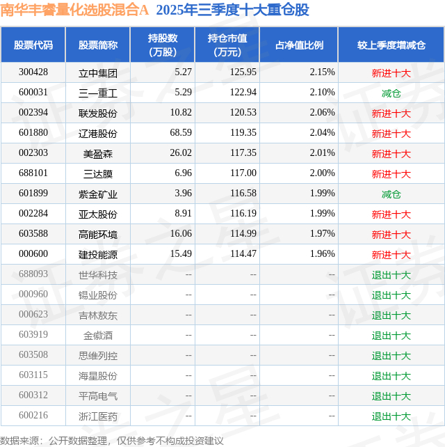 南华丰睿量化选股混合A的前十大重仓股如下: