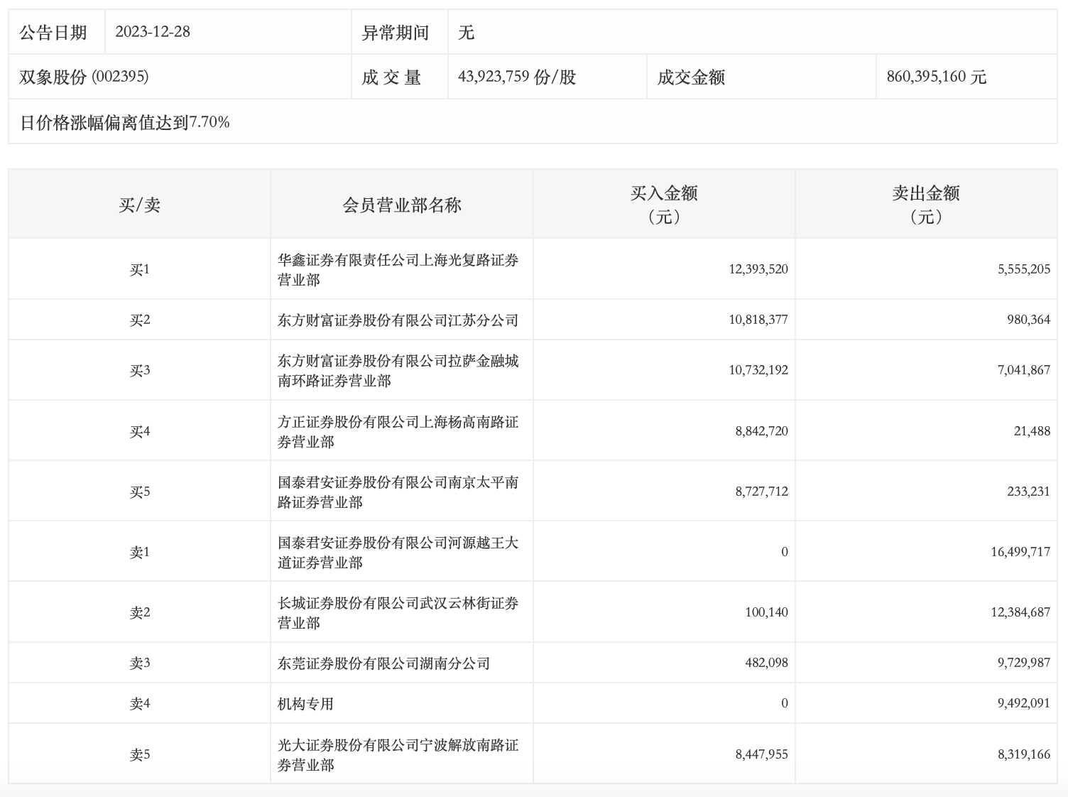 双象股份今日涨停,龙虎榜数据显示,上榜营业部席位全天成交1.31亿元,占当日总成交金额比例为15.2%。其中,买入金额为6054.47万元,卖出金额为7025.78万元,合计净卖出971.31万元。