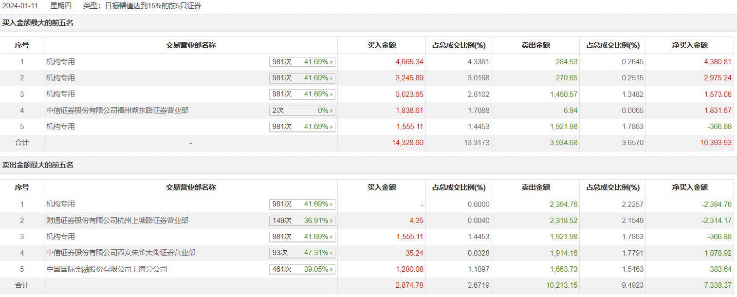 1月11日跌5.19%,成交额10.76亿元,换手率18.26%,盘后龙虎榜数据显示,三机构专用席位净买入8929.13万元,二机构专用席位净卖出2761.64万元。