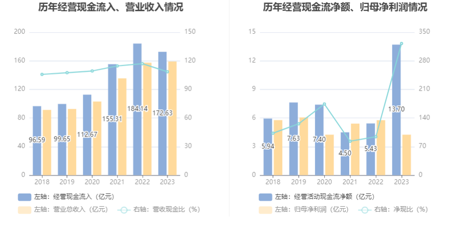 2023年,公司经营活动现金流净额为13.70亿元,同比增长152.52%;筹资活动现金流净额-7.84亿元,同比减少29.67亿元;投资活动现金流净额-6.65亿元,上年同期为-4.41亿元。