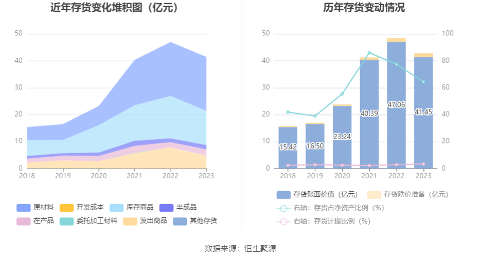 从存货变动来看,截至2023年年末,公司存货账面价值为41.45亿元,占净资产的64.44%,较上年末减少5.6亿元。其中,存货跌价准备为1.45亿元,计提比例为3.37%。