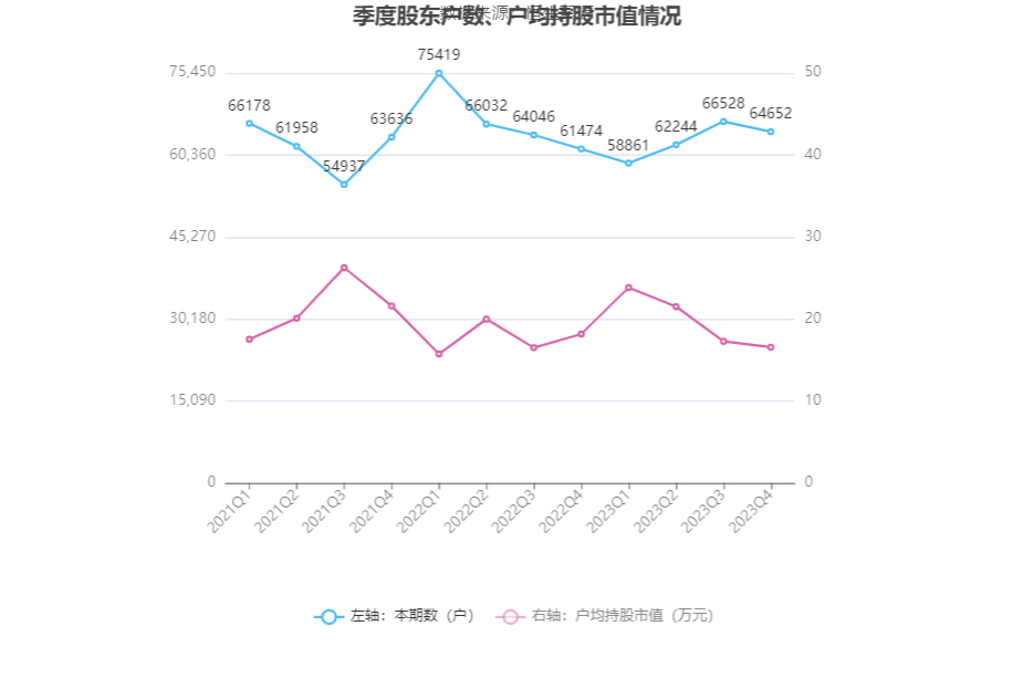 筹码集中度方面,截至2023年年末,公司股东总户数为6.47万户,较三季度末下降了1876户,降幅2.82%;户均持股市值由三季度末的17.28万元下降至16.57万元,降幅为4.11%。