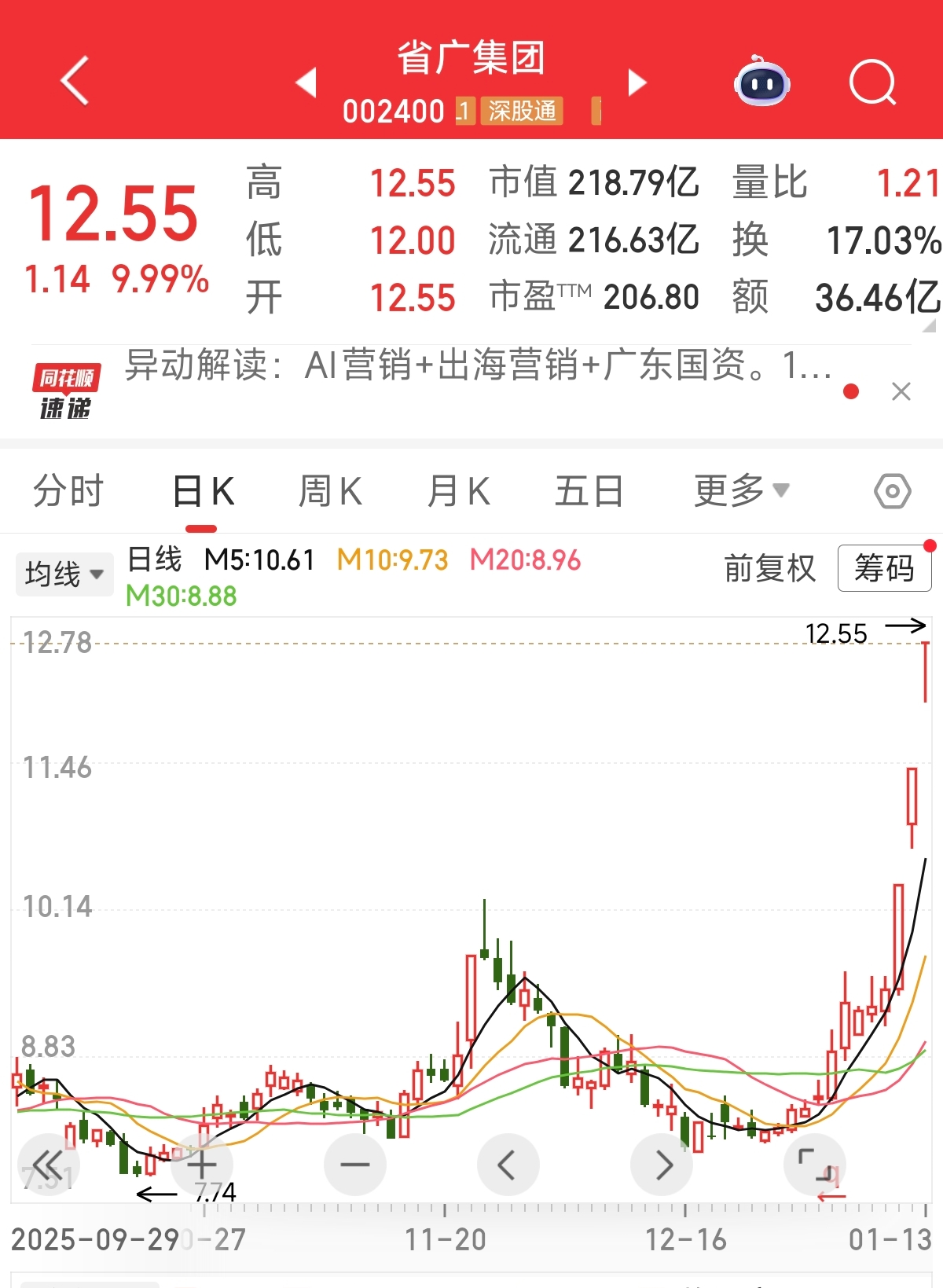 上证报中国证券网讯(记者 窦世平)省广集团1月13日盘中收获涨停,报12.55元/股。