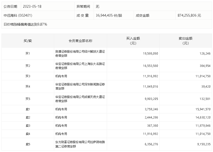 5月18日,中远海科今日涨停,龙虎榜数据显示,上榜营业部席位全天成交1.46亿元,占当日总成交金额比例为16.71%。其中,买入金额为8273.81万元,卖出金额为6330.87万元,合计净买入1942.93万元。