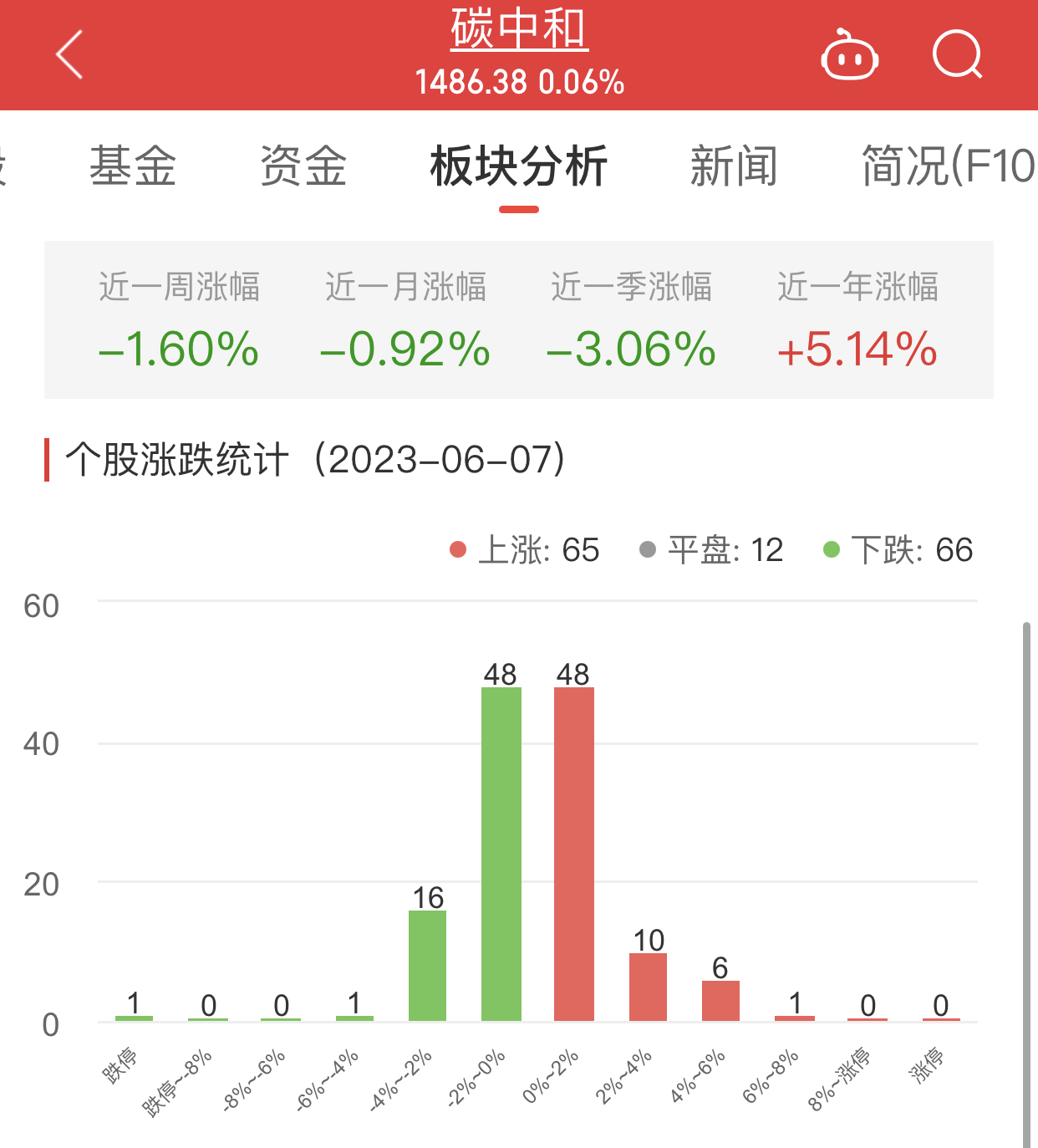 中国经济网北京6月7日讯 今日,碳中和板块整体涨幅0.06%,其中65只股票上涨,12只股票平盘,66只股票下跌。