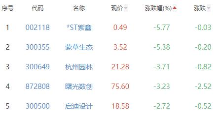 *ST紫鑫、蒙草生态、杭州园林、曙光数创、启迪设计位列涨幅榜后五位,涨幅分别为-5.77%、-5.38%、-3.71%、-3.23%、-2.72%。