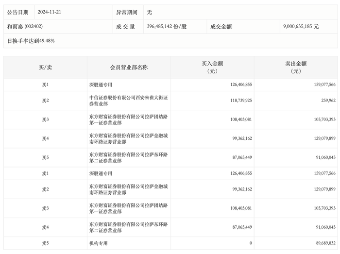 11月21日,和而泰今日涨停,龙虎榜数据显示,上榜营业部席位全天成交11.15亿元,占当日总成交金额比例为12.39%。其中,买入金额为5.4亿元,卖出金额为5.75亿元,合计净卖出3489.32万元。