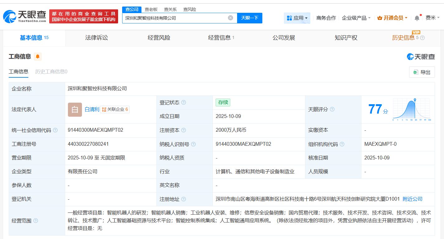 每经AI快讯,天眼查App显示,近日,深圳和聚智控科技有限公司成立,法定代表人为白清利,注册资本2000万元人民币,经营范围包括智能机器人的研发、智能机器人销售、人工智能基础资源与技术平台等,由和而泰(002402)、东方精工(002611)、乐聚智能(深圳)股份有限公司、刘磊共同持股。